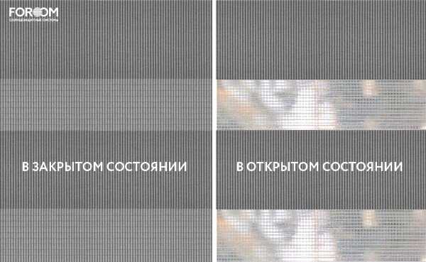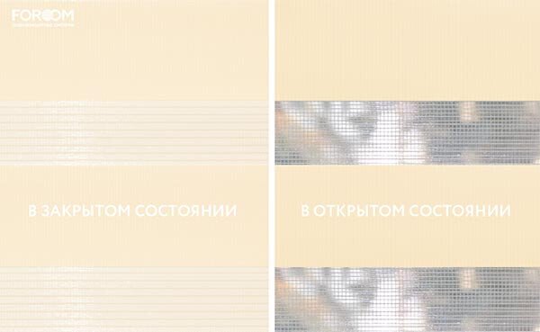 Полотно ткани, состоит из чередующихся горизонтальных полос – прозрачных и непрозрачных. Изменяя положение этих полос относительно друг другу, можно создать целых 3 режима регулировки светом. Например, чтобы в помещении стало светлее, нужно расположить прозрачные полосы друг напротив друга. Если разместить прозрачную и непрозрачную полосу параллельно друг другу, то можно добиться практически полного затемнения.